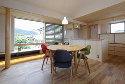 間口5mの南北に伸びる細長い敷地。遠く西に美毳山が見えたときにはもうダイニングテーブルの位置が決まっていました。山並みを望める大開口。問題は西日をどう遮るか。答えはガラリの木製引き戸でした。