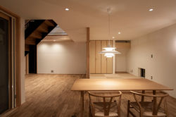 傾斜のある道路を登った先に建つ。高い位置から遠くを見渡せるような開口部の計画と1階・2階が縦につながる吹抜を中心とした住まい。